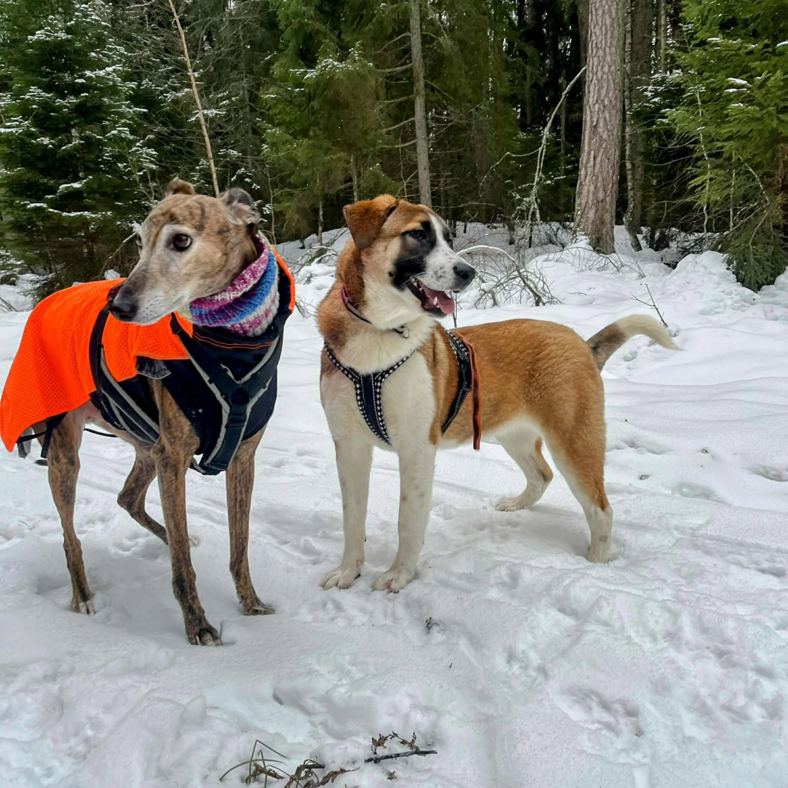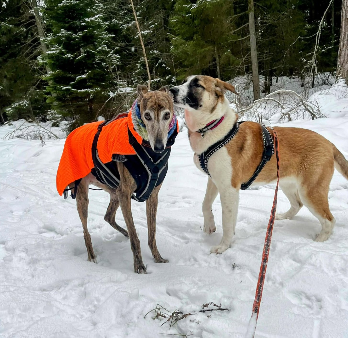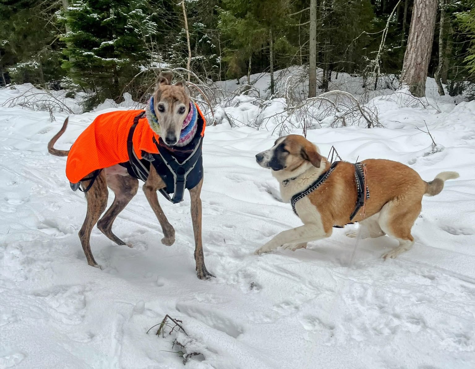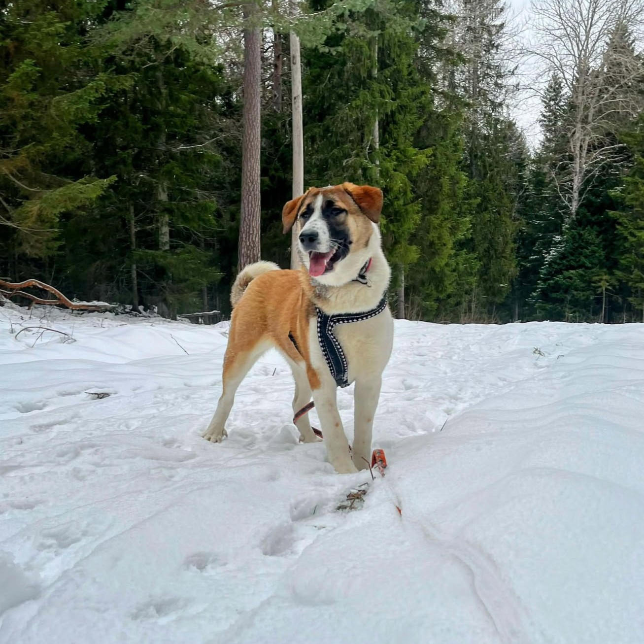 Snö är något av det bästa hon vet! Att hoppa upp på snövallar och springa runt i djupsnö är inga hinder alls. Hon är pigg, nyfiken och tycker om att vara i rörelse. Något tydligt jaktintresse har inte setts, men hon är ännu inte redo att gå lös. Inkallning tränas i långlina och leklusten är stor, så träningen fortsätter i lugn takt.